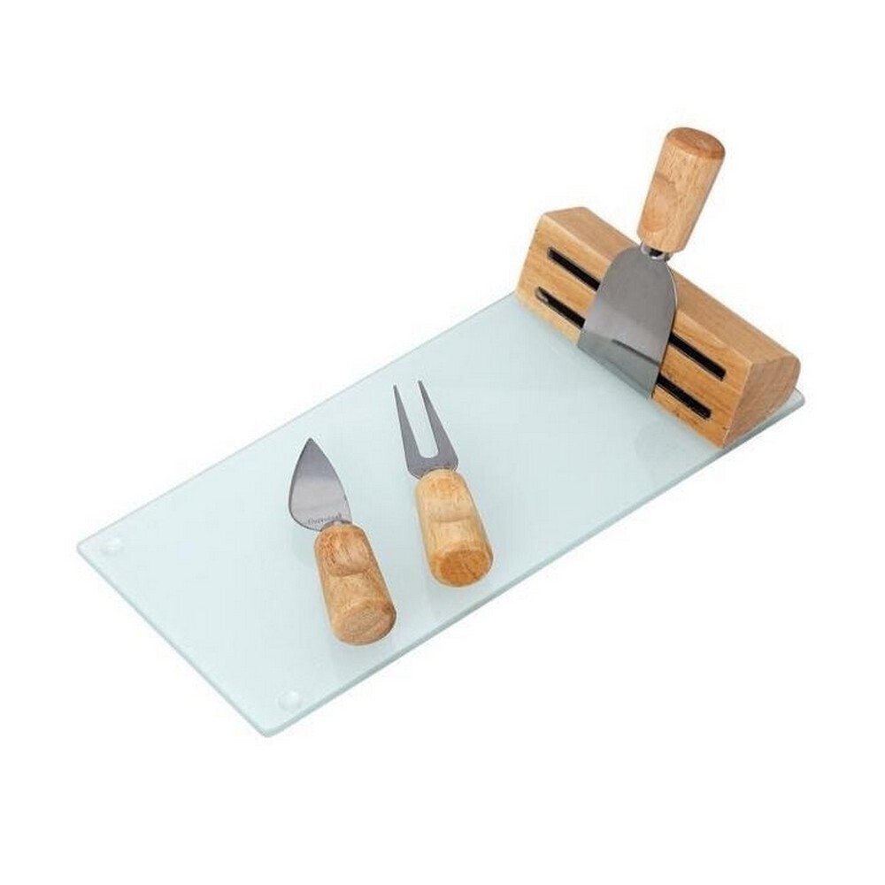 Πιατέλα τυριών Cryspo Trio Lotos ματ από γυαλί με σετ 3 μαχαιριών τυριού 65.000.143Σετ τυριών που αποτελείται από βάση από ματ γυαλί και μαχαίρια κατασκευασμένα από μείγμα ανοξείδωτου ξύλου και λωτού.Διαστάσεις: 30x14 εκ.