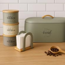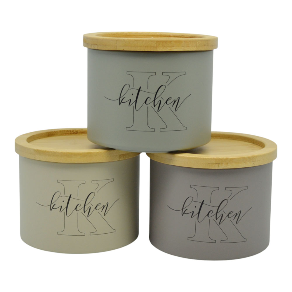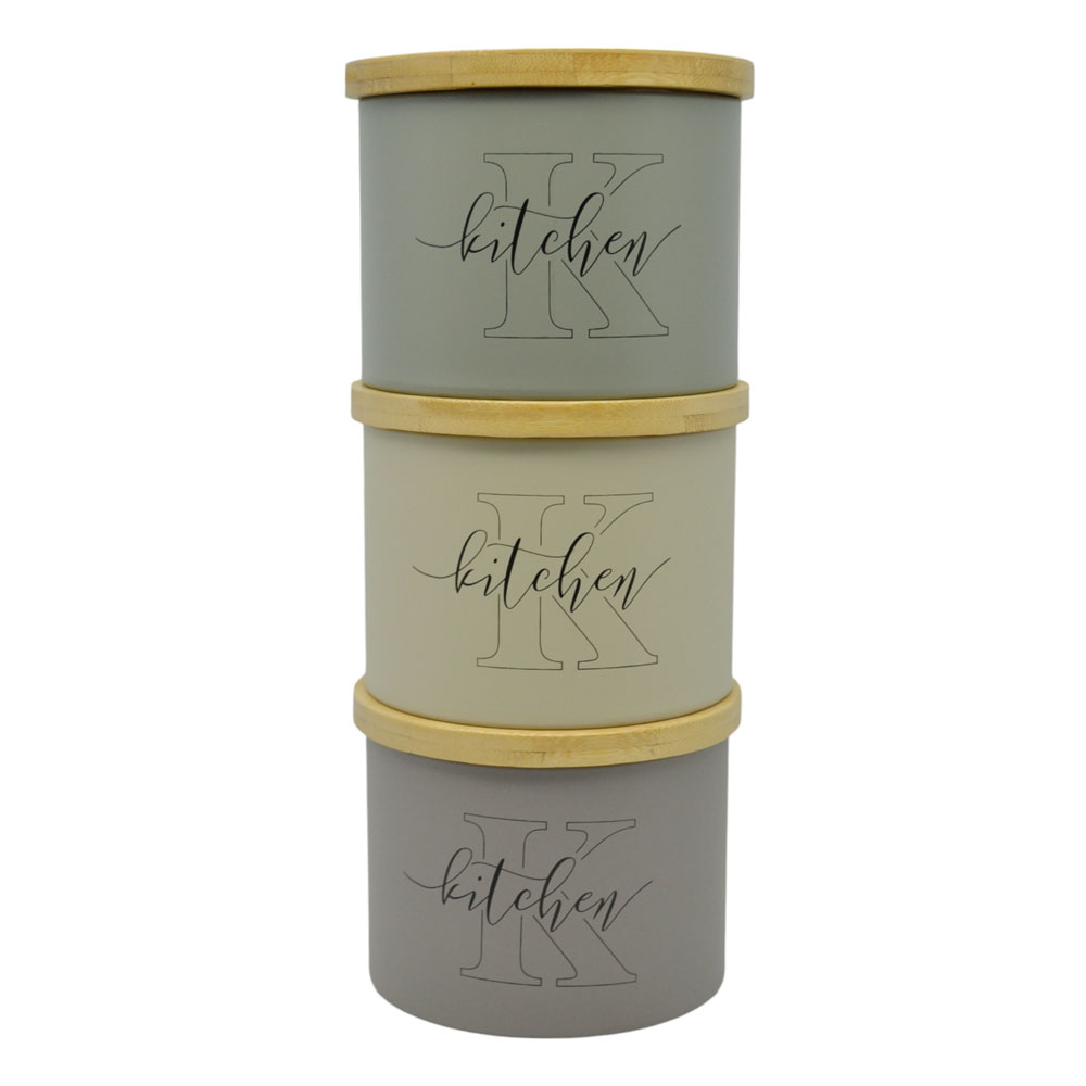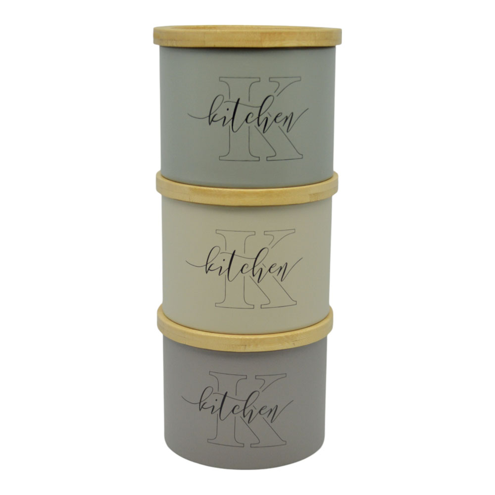 Σετ 3 μεταλλικά βάζα σε μπεζ, taupe και λαδί χρώμα, με διακριτική επιγραφή Kitchen και ξύλινα καπάκια με εσωτερική σιλικόνη για αεροστεγές κλείσιμο. Ιδανικά για την αποθήκευση καφέ, ζάχαρης, τσαγιού ή άλλων ξηρών τροφίμων.