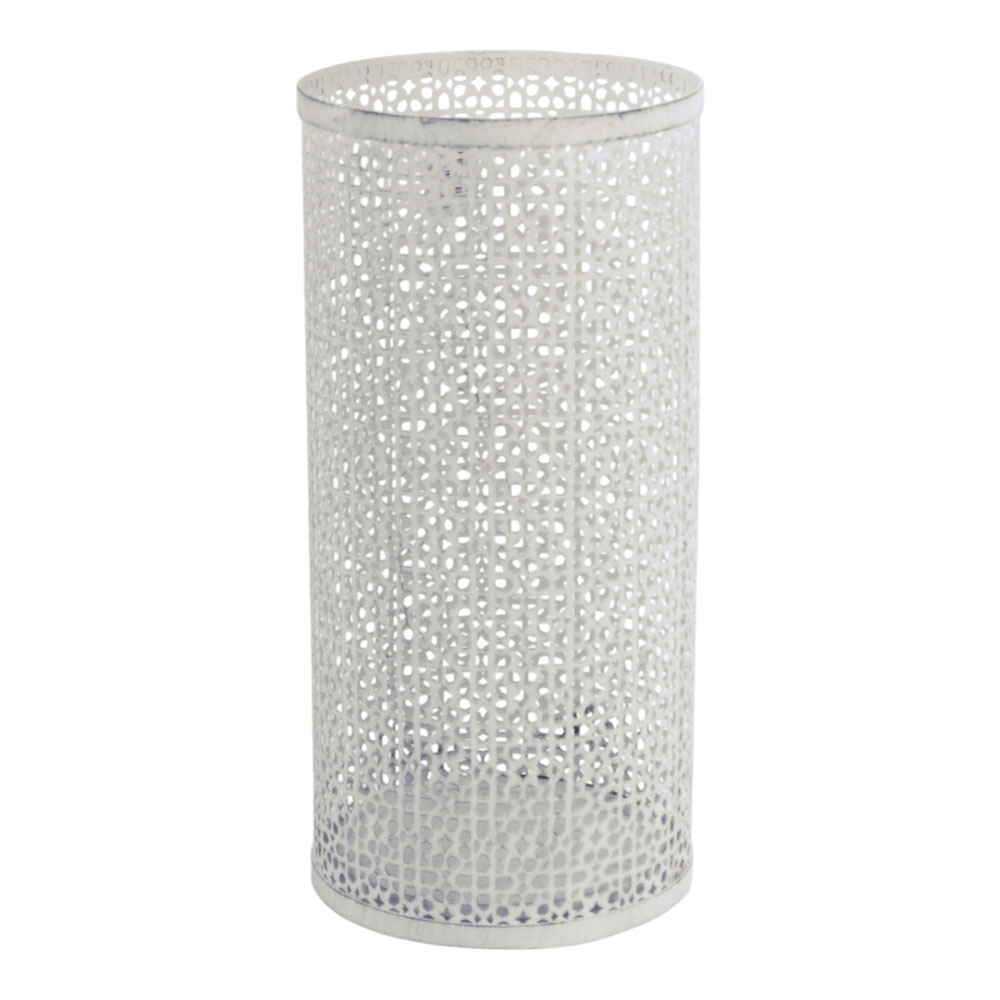 Ομπρελοθήκη μεταλλική στρογγυλή, με μεταλλικό πάτο σε εκρού αντικέ χρώμα και διακριτική διάτρητη διακόσμηση.