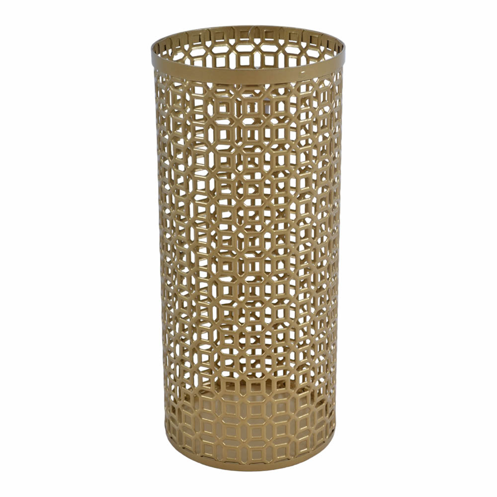 Ομπρελοθήκη μεταλλική στρογγυλή, με μεταλλικό πάτο σε χρυσό ματ χρώμα και διάτρητη διακόσμηση.