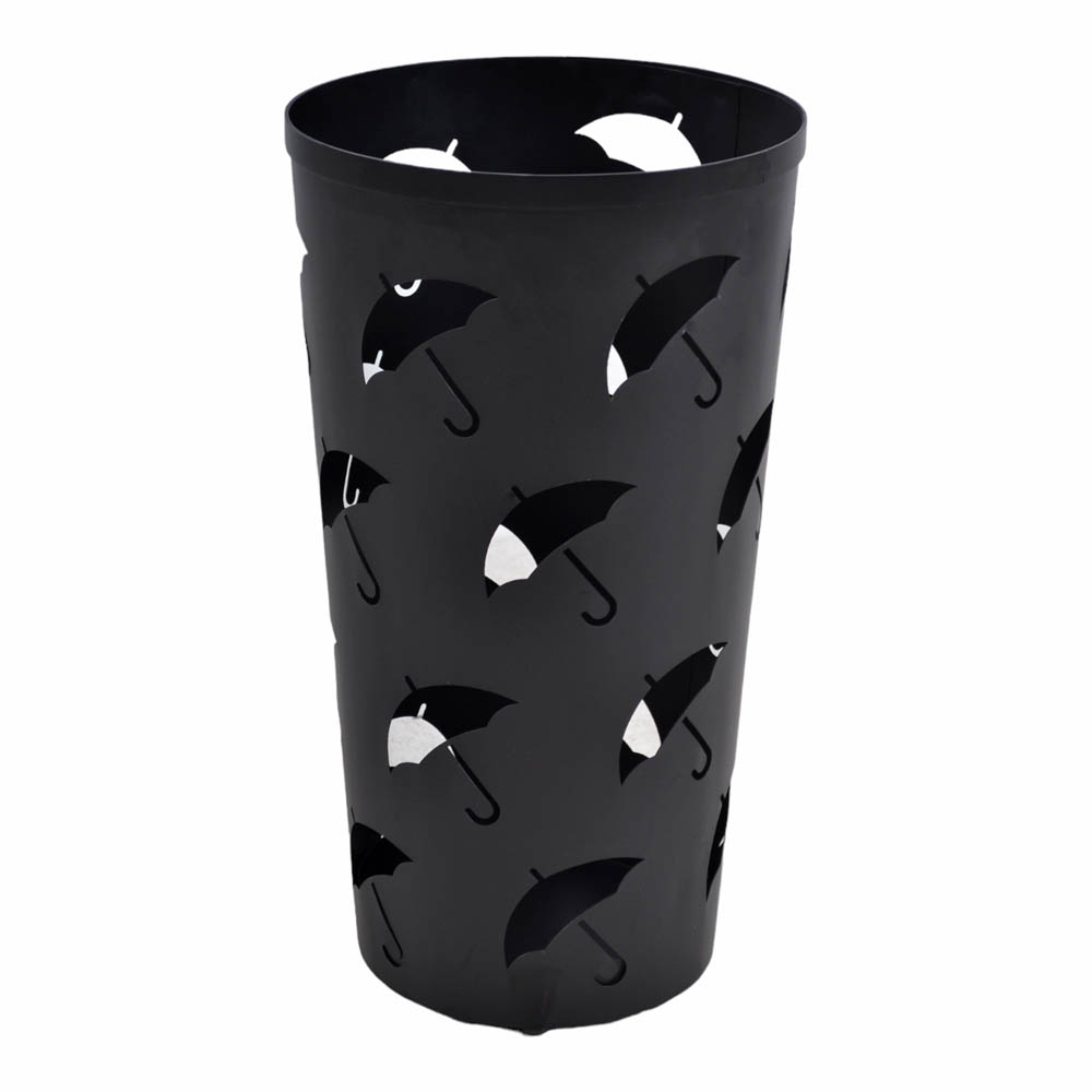Ομπρελοθήκη μεταλλική στρογγυλή, με μεταλλικό πάτο σε μαύρο ματ χρώμα και διακόσμηση διάτρητες ομπρέλες.