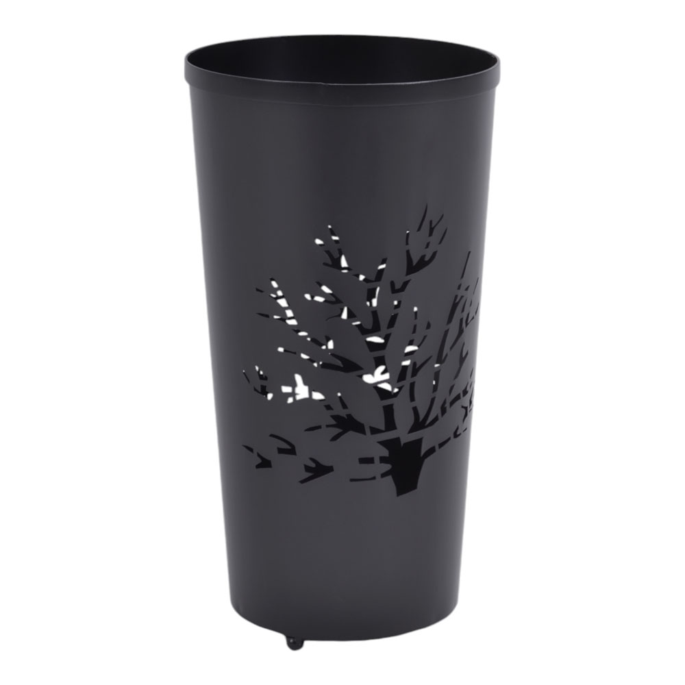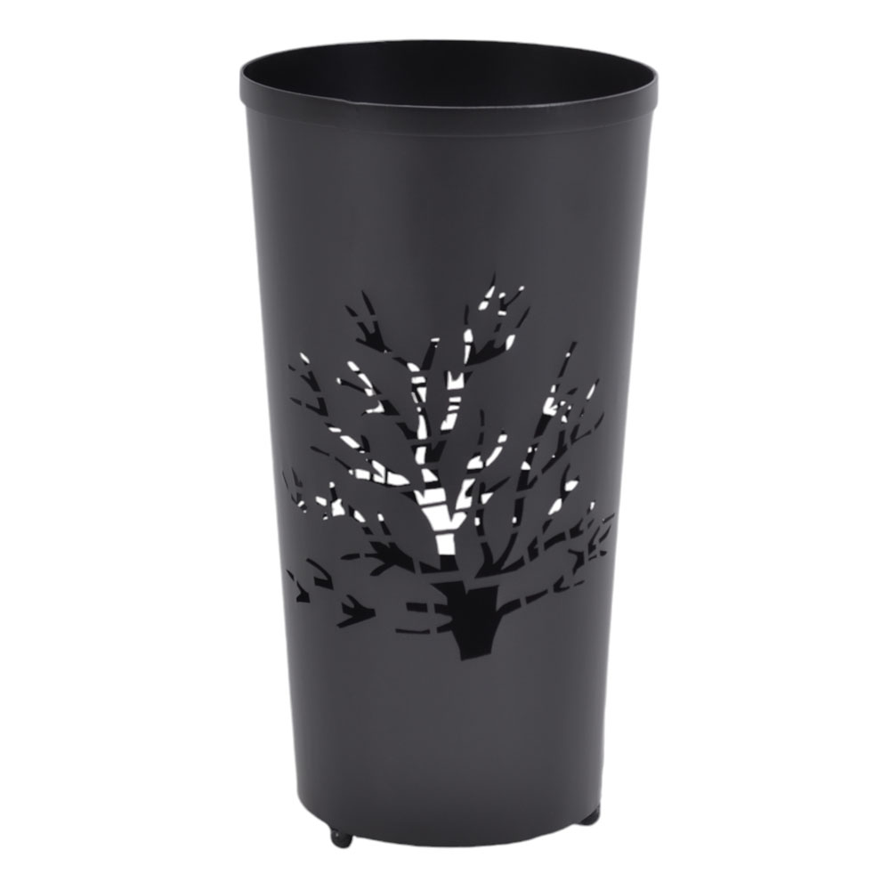 Ομπρελοθήκη μεταλλική στρογγυλή, με μεταλλικό πάτο σε μαύρο ματ χρώμα και διακόσμηση διάτρητο δέντρο.