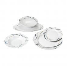 Σερβίτσιο φαγητού πορσελάνης,στρογγυλό,με διακόσμηση στο πλαίσιο.Το σετ περιλαμβάνει 6 πιάτα ρηχά 26εκ.,6 βαθιά 21,5εκ.,6 φρούτου 19εκ.,μια σαλατιέρα 23εκ.κ μια οβάλ πιατέλα 35εκ.Κατάλληλα για χρήση στο πλυντήριο πιάτων και τον φούρνο μικροκυμάτων.