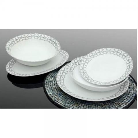 Σερβίτσιο φαγητού 20 τεμαχίων πορσελάνης με γκρι γεωμετρικά σχήματα σχέδια.  Κατάλληλο για πλυντήριο πιάτων και φούρνο μικροκυμάτων.  Το σετ περιλαμβάνει:  6 ρηχά πιάτα 26.50εκ   6 βαθιά πιάτα 23εκ.   6 πιάτα φρούτου 20.50εκ.   1 πιατέλα οβάλ 30εκ.  1 σαλατιέρα  23εκ.