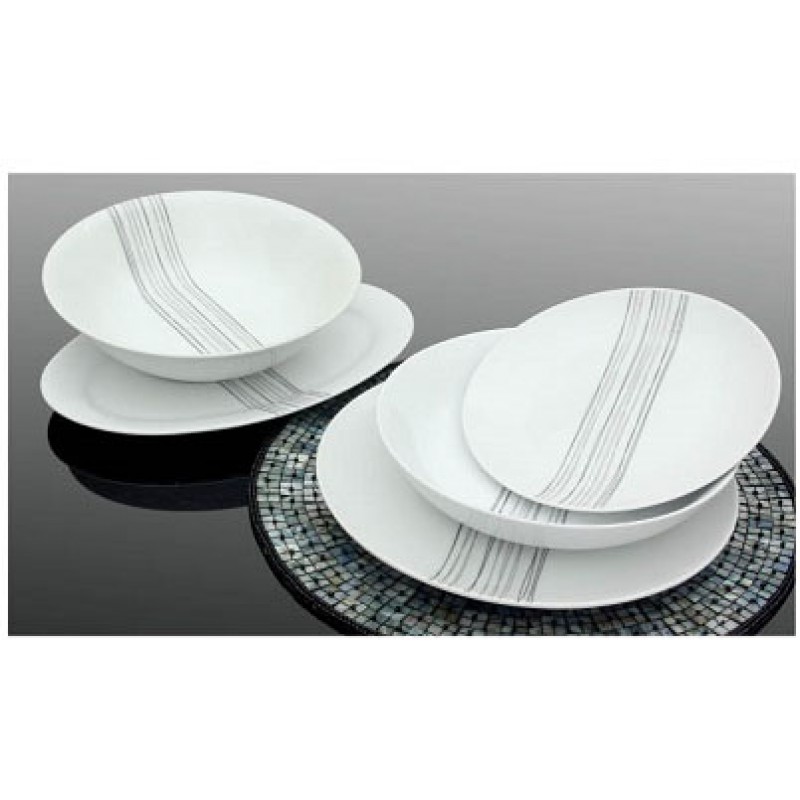 Σερβίτσιο φαγητού 20 τεμαχίων πορσελάνης με γκρι γραμμές σχέδιο.  Κατάλληλο για πλυντήριο πιάτων και φούρνο μικροκυμάτων.Το σετ περιλαμβάνει:6 ρηχά πιάτα 26.50εκ 6 βαθιά πιάτα 23εκ.6 πιάτα φρούτου 20.50εκ. 1 πιατέλα οβάλ 30εκ.1 σαλατιέρα  23εκ.