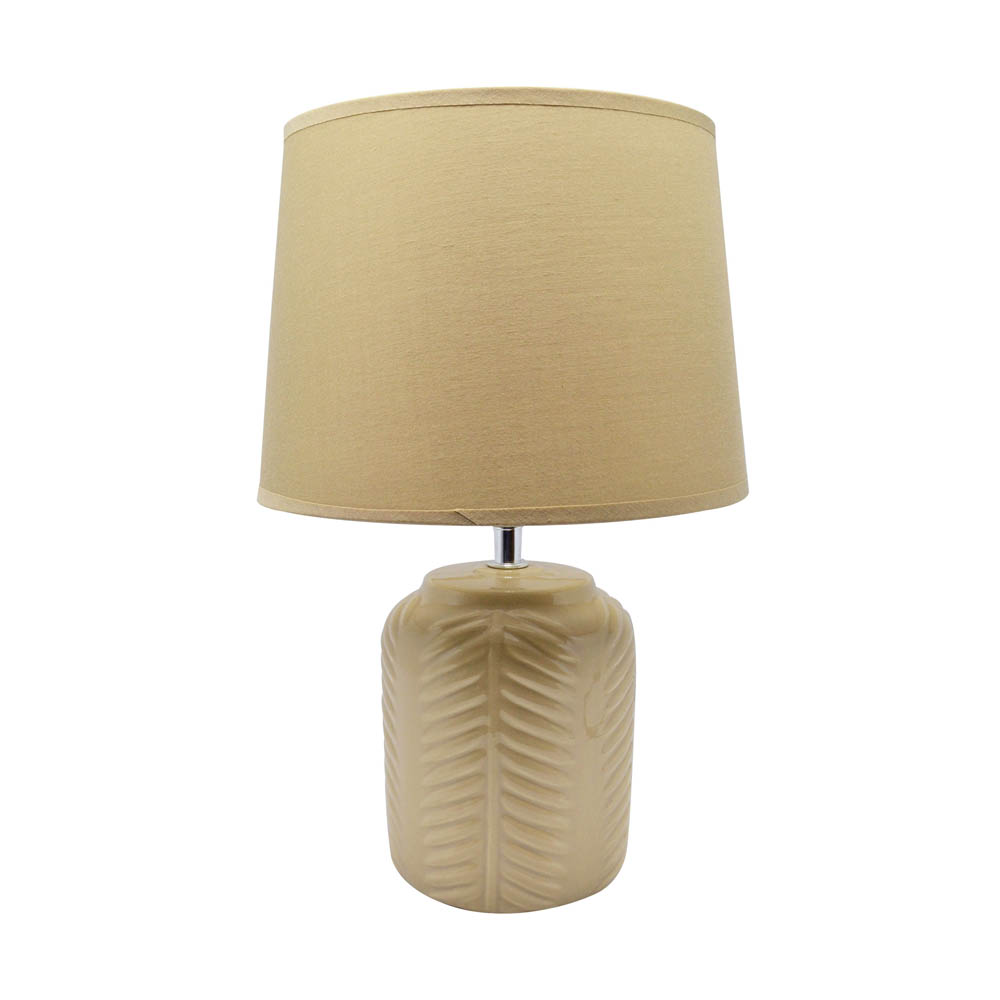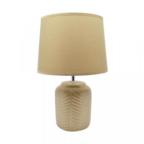 Πορτατίφ κεραμικό με διακόσμηση ανάγλυφες γραμμές και υφασμάτινο καπέλο σε καφέ μπεζ χρώμα. Δέχεται έναν λαμπτήρα Ε14 ΜΑΧ 40W, ο οποίος δεν περιλαμβάνεται στη συσκευασία. Διάσταση καπέλου 23x20,5x17,1εκ. Διάσταση βάσης 12,5x12,5x15εκ.