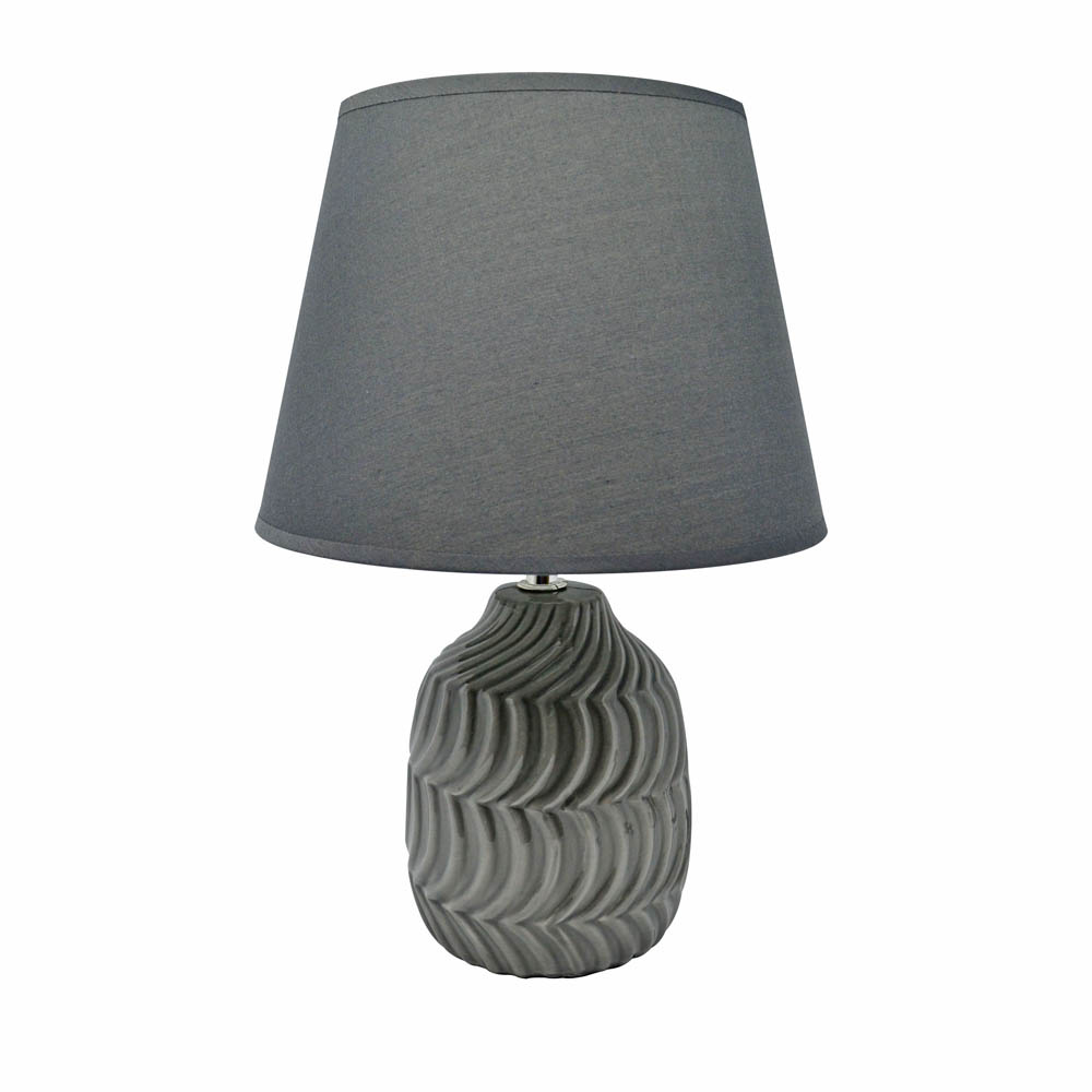 Πορτατίφ κεραμικό με διακόσμηση ανάγλυφες ακανόνιστες γραμμές και υφασμάτινο καπέλο σε σκούρο γκρι χρώμα. Δέχεται έναν λαμπτήρα Ε14 ΜΑΧ 40W, ο οποίος δεν περιλαμβάνεται στη συσκευασία. Διάσταση καπέλου 22,5x15,5x16,5εκ. Διάσταση βάσης 12x12x15εκ.