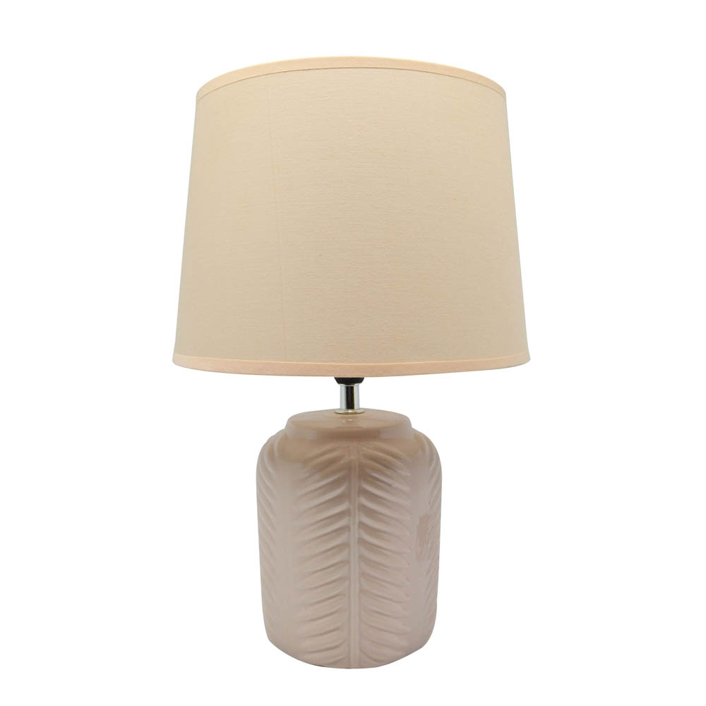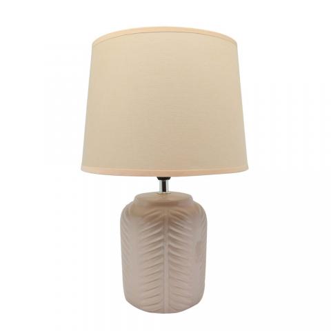 Πορτατίφ κεραμικό με διακόσμηση ανάγλυφες γραμμές και υφασμάτινο καπέλο σε σομόν χρώμα. Δέχεται έναν λαμπτήρα Ε14 ΜΑΧ 40W, ο οποίος δεν περιλαμβάνεται στη συσκευασία. Διάσταση καπέλου 23x20,5x17,1εκ. Διάσταση βάσης 12,5x12,5x15εκ.