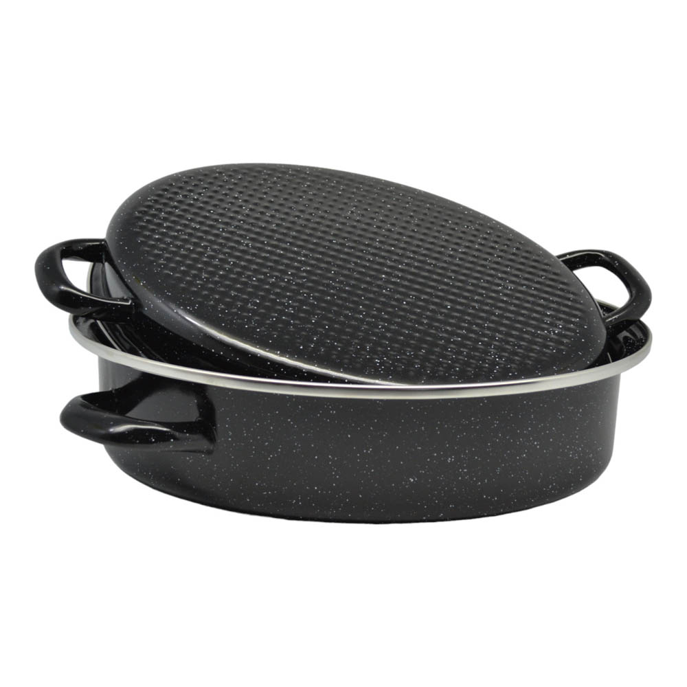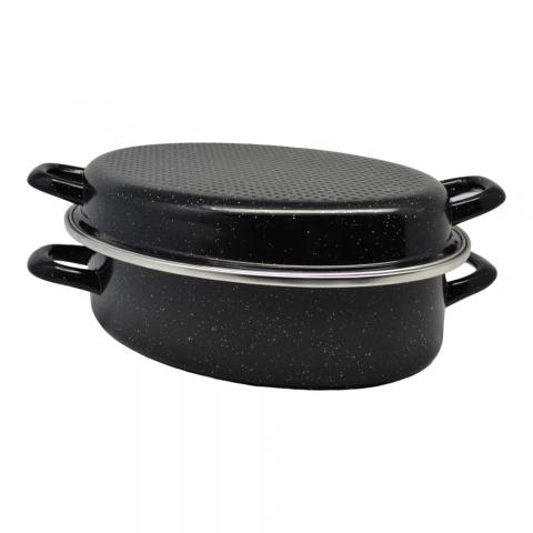 Γάστρα φούρνου βαρέως τύπου,με εμαγιέ αντικολλητική επίστρωση,καπάκι κ σχάρα,άριστης ποιότητας,ιδανική για χρήση σε υψηλές θερμοκρασίες.Διανέμει ομοιόμορφα την θερμότητα κατά το ψήσιμο κ έχει εξαιρετική ανθεκτικότητα.Ασφαλής η χρήση σε πλυντήριο πιάτων.