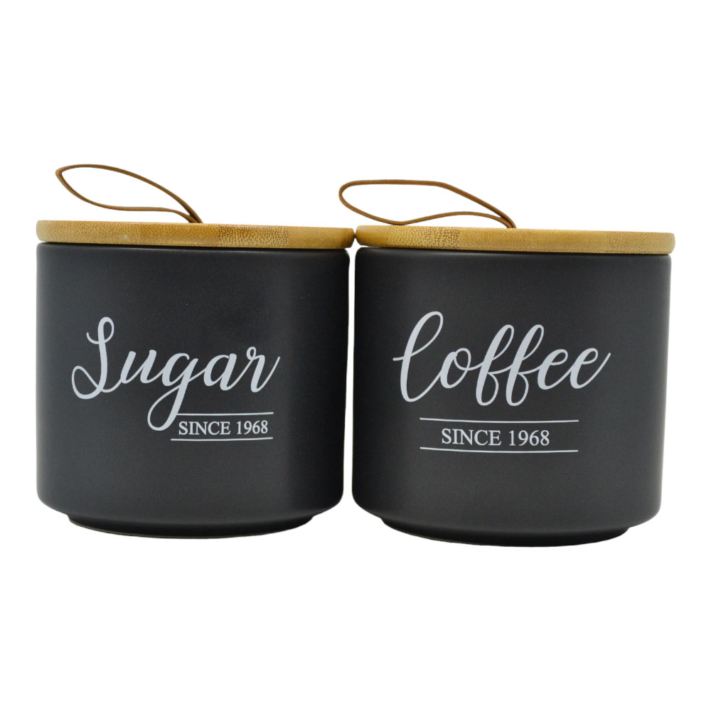 Σετ δύο τεμαχίων βάζα αποθήκευσης για ζάχαρη και καφέ, κεραμικά σε μαύρο ματ χρώμα και επιγραφή Sugar Coffee. Διαθέτει κούμπωμα ασφαλείας από ξύλο μπαμπού.