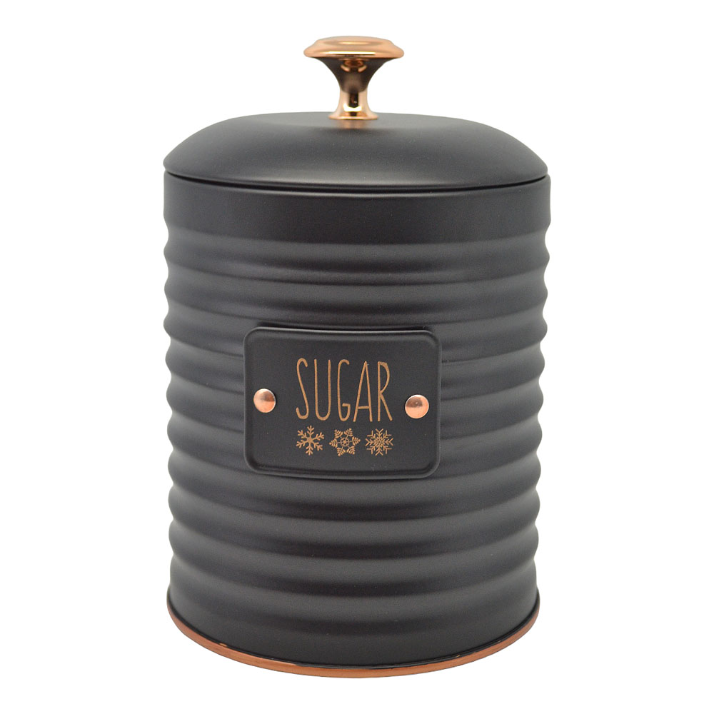 Βάζο αποθήκευσης μεταλλικό σε μαύρο ματ χρώμα με ανάγλυφες ρίγες, rose gold διακόσμηση και επιγραφή Sugar. Συνδυάστε το με τα υπόλοιπα αντικείμενα της σειράς και ανανεώστε τον χώρο σας.