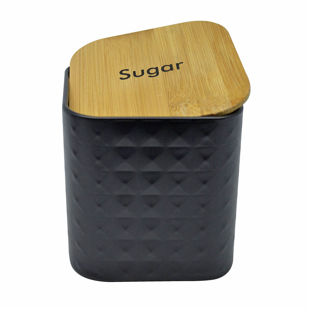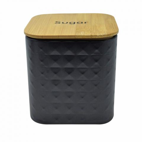 Βάζο αποθήκευσης μεταλλικό σε μαύρο ματ χρώμα με ανάγλυφη διακόσμηση, επιγραφή Sugar και κούμπωμα από ξύλο μπαμπού.