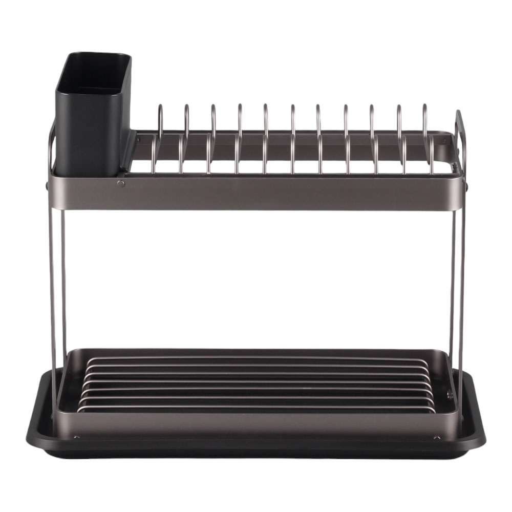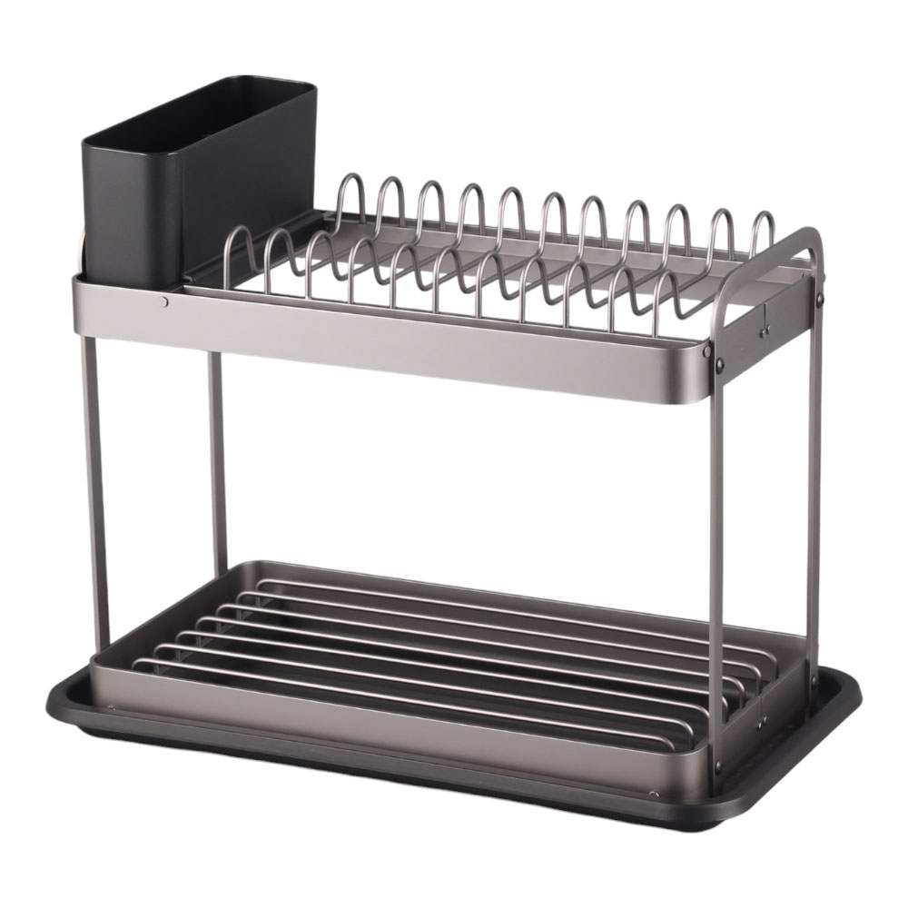 Διώροφη πιατοθήκη από αλουμίνιο υψηλής αντοχής, σε γκρι φιμέ χρώμα, με μαύρο πλαστικό δίσκο και κουταλοθήκη. Ανθεκτική στη σκουριά, καθαρίζεται εύκολα και διαθέτει ευρύχωρους χώρους για αποθήκευση πιάτων και σκευών. Ιδανική για καθημερινή χρήση.
