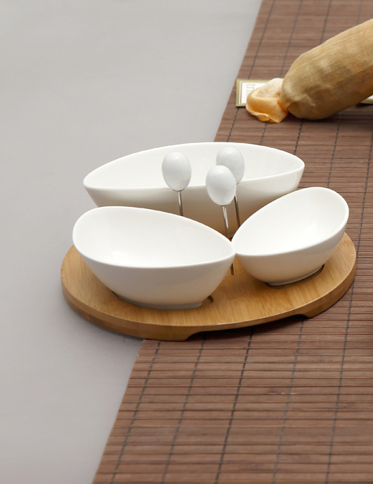 Τρία μπολ πορσελάνινα σε ξύλινη βάση bamboo με τρία πιρουνάκια, κατάλληλα για  ντιπς, ελιές, ορεκτικά.Διάσταση μπολ Νο 1: 16Χ10εκ.Διάσταση μπολ Νο 2: 13Χ8,5εκΔιάστασημπολ Νο 3: 11.5Χ7εκΔιάμετρος ξύλινης βάσης: 21,5εκ.Τα μπολ είναι κατάλληλα για πλυντήριο πιάτων και φούρνο μικροκυμάτων.Διατίθεται σε συσκευασία δώρου.