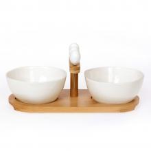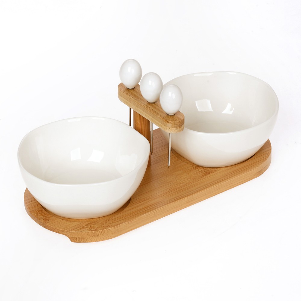 Δύο μπολ πορσελάνινα σε ξύλινη βάση bamboo με τρία πιρουνάκια, κατάλληλα για  ντιπς, ελιές, ορεκτικά.Διάσταση μπολ: 11 εκ.Διάσταση ξύλινης βάσης: 25Χ11εκ.Τα μπολ είναι κατάλληλα για πλυντήριο πιάτων και φούρνο μικροκυμάτων.Διατίθεται σε συσκευασία δώρου.