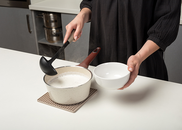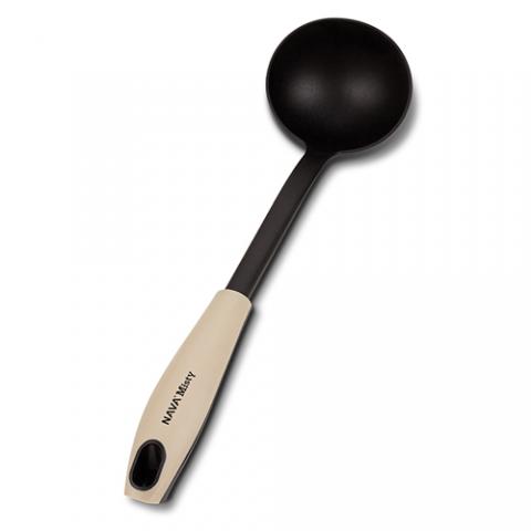 Κουτάλα σούπας MistyΣερβίρετε τις αγαπημένες σας δημιουργίες με την βαθιά κουτάλα σούπας Misty της NAVA. Ιδανική για ανακάτεμα ή για σερβίρισμα σούπας, ζωμού, σάλτσας κ.α.Κατασκευασμένη από υλικό nylon υψηλής ποιότητας, το οποίο είναι κατάλληλο για τρόφιμα, ενώ ταυτόχρονα την καθιστά ιδιαίτερα ανθεκτική στη θερμοκρασία έως και τους 200οC. Ενδείκνυται για όλα τα σκεύη, αντικολλητικά ή μη, αλλά και γυάλινα.Διαθέτει εργονομική, αντιολισθητική soft touch λαβή, για άνετο και ασφαλή χειρισμό. Η πρακτική οπή στην άκρη της λαβής σας δίνει τη δυνατότητα να την κρεμάτε. Εργαλεία κουζίνας MistyΗ σειρά εργαλείων και αξεσουάρ κουζίνας Misty έχει σχεδιαστεί για τους λάτρεις της κουζίνας και της μαγειρικής. Σε αυτή τη σειρά θα βρεις ό,τι μπορείς να φανταστείς για τη κουζίνα σου, από τα πιο απλά εργαλεία, μέχρι τα πιο ιδιαίτερα gadgets. Βασισμένη στον σχεδιασμό των σύγχρονων εργαλείων κουζίνας, ακολουθεί τις αρχές της λειτουργικότητας και της καινοτομίας με σκοπό να εξυπηρετεί ποικιλοτρόπως τις πολλαπλές ανάγκες της μοντέρνας κουζίνας. Η εξαιρετική ποιότητα των υλικών κατασκευής εξασφαλίζει μεγαλύτερη διάρκεια ζωής των εργαλείων και τα καθιστά ανθεκτικά στη θερμοκρασία.Τα προϊόντα της σειράς Misty κατασκευάζονται από υλικά υψηλής αντοχής στη θερμοκρασία και σύμφωνα με τους κανονισμούς για προϊόντα που έρχονται σε επαφή με τρόφιμα και αποτελούν την απόλυτα υγιεινή και ασφαλή επιλογή για την κουζίνα σας. Κατάλληλο για πλυντήριο πιάτων.Κατάλληλο για ανοξείδωτα, αλλά και για αντικολλητικά σκεύη καθώς δεν τα χαράζει και δεν καταστρέφει την αντικολλητική επίστρωση. Οδηγίες χρήσης - Πριν από την πρώτη χρήση, πλύνετε το προϊόν με ζεστό νερό, καθαριστικό υγρό πιάτων και μαλακό σφουγγάρι.- Μετά από κάθε χρήση, πλύνετε και στεγνώστε καλά με ένα στεγνό πανί.- Μη χρησιμοποιείτε μεταλλικά σφουγγάρια, σύρμα ή σκληρά καθαριστικά.- Μην αφήνετε το προϊόν μέσα στο σκεύος κατά τη διάρκεια του μαγειρέματος.- Κατασκευασμένο σύμφωνα με τους κανονισμούς για προϊόντα που έρχονται σε επαφή με τρόφιμα