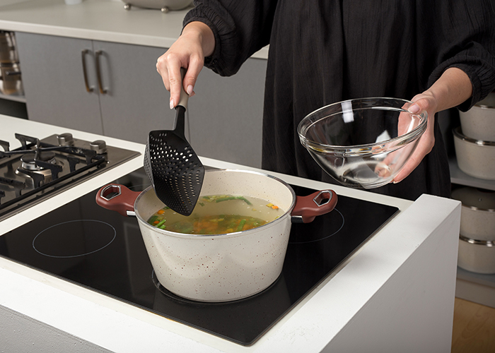Κουτάλα-Στραγγιστήρι ζυμαρικών MistyΚουτάλα-Στραγγιστήρι ζυμαρικών Misty της NAVA. Ιδανικό εργαλείο για το στράγγισμα και σερβίρισμα ζυμαρικών, λαχανικών, κ.λπ. από το βραστό νερό απευθείας στο πιάτο, εύκολα και γρήγορα, χωρίς την χρήση επιπλέον σκευών, ενώ παράλληλα σας επιτρέπει να επαναχρησιμοποιήσετε άμεσα το βρασμένο νερό για άλλη χρήση. Με μεγάλη χωρητικότητα, για μεταφορά επαρκούς ποσότητας με μία μόνο κίνηση.Κατασκευασμένη από υλικό nylon υψηλής ποιότητας, το οποίο είναι κατάλληλο για τρόφιμα, ενώ ταυτόχρονα την καθιστά ιδιαίτερα ανθεκτική στη θερμοκρασία έως και τους 200οC. Ενδείκνυται για όλα τα σκεύη, αντικολλητικά ή μη, αλλά και γυάλινα.Διαθέτει εργονομική, αντιολισθητική soft touch λαβή, για άνετο και ασφαλή χειρισμό. Η πρακτική οπή στην άκρη της λαβής σας δίνει τη δυνατότητα να την κρεμάτε. Εργαλεία κουζίνας MistyΗ σειρά εργαλείων και αξεσουάρ κουζίνας Misty έχει σχεδιαστεί για τους λάτρεις της κουζίνας και της μαγειρικής. Σε αυτή τη σειρά θα βρεις ό,τι μπορείς να φανταστείς για τη κουζίνα σου, από τα πιο απλά εργαλεία, μέχρι τα πιο ιδιαίτερα gadgets. Βασισμένη στον σχεδιασμό των σύγχρονων εργαλείων κουζίνας, ακολουθεί τις αρχές της λειτουργικότητας και της καινοτομίας με σκοπό να εξυπηρετεί ποικιλοτρόπως τις πολλαπλές ανάγκες της μοντέρνας κουζίνας. Η εξαιρετική ποιότητα των υλικών κατασκευής εξασφαλίζει μεγαλύτερη διάρκεια ζωής των εργαλείων και τα καθιστά ανθεκτικά στη θερμοκρασία.Τα προϊόντα της σειράς Misty κατασκευάζονται από υλικά υψηλής αντοχής στη θερμοκρασία και σύμφωνα με τους κανονισμούς για προϊόντα που έρχονται σε επαφή με τρόφιμα και αποτελούν την απόλυτα υγιεινή και ασφαλή επιλογή για την κουζίνα σας. Κατάλληλο για πλυντήριο πιάτων.Κατάλληλο για ανοξείδωτα, αλλά και για αντικολλητικά σκεύη καθώς δεν τα χαράζει και δεν καταστρέφει την αντικολλητική επίστρωση. Οδηγίες χρήσης - Πριν από την πρώτη χρήση, πλύνετε το προϊόν με ζεστό νερό, καθαριστικό υγρό πιάτων και μαλακό σφουγγάρι.- Μετά από κάθε χρήση, πλύνετε και στεγνώστε καλά με ένα στεγνό πανί.- Μη χρησιμοποιείτε μεταλλικά σφουγγάρια, σύρμα ή σκληρά καθαριστικά.- Μην αφήνετε το προϊόν μέσα στο σκεύος κατά τη διάρκεια του μαγειρέματος.- Κατασκευασμένο σύμφωνα με τους κανονισμούς για προϊόντα που έρχονται σε επαφή με τρόφιμα.