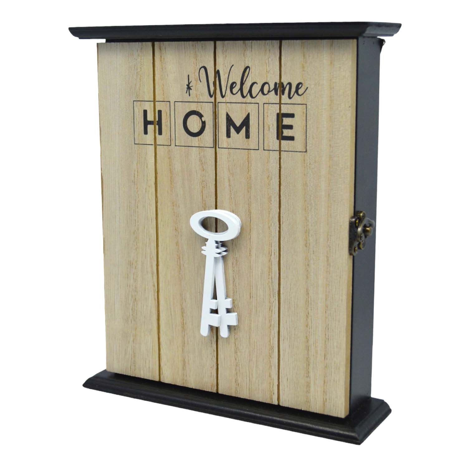 Κλειδοθήκη κατασκευασμένη από ξύλο, ανθεκτική και πρακτική, ιδανική για να διατηρήσετε τα κλειδιά σας οργανωμένα και να προσθέσετε ένα ξεχωριστό στυλ στη διακόσμησή σας. Είναι σε φυσικό χρώμα με μαύρες λεπτομέρειες και επιγραφή Welcome Home