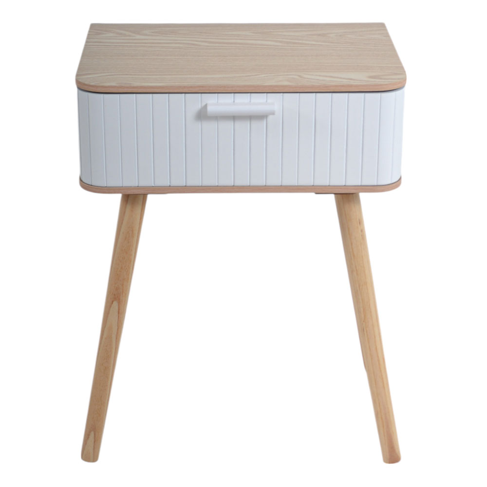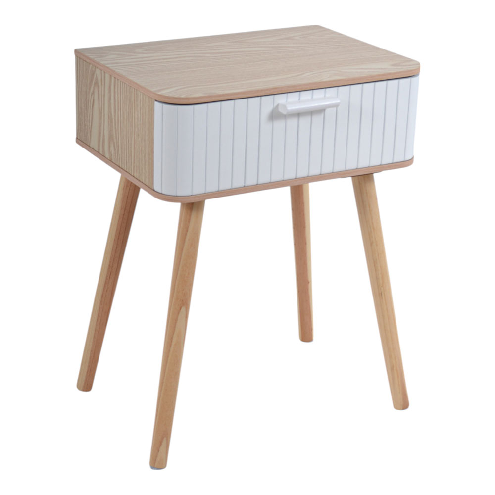 Κομοδίνο με συρτάρι σε μοντέρνο σχεδιασμό, με επιφάνεια σε φυσική όψη ξύλου, λευκό μπροστινό μέρος με κάθετες γραμμώσεις και εργονομική λαβή. Ιδανικό για υπνοδωμάτιο, σαλόνι ή γραφείο, συνδυάζει πρακτικότητα και κομψότητα.
