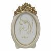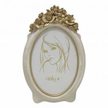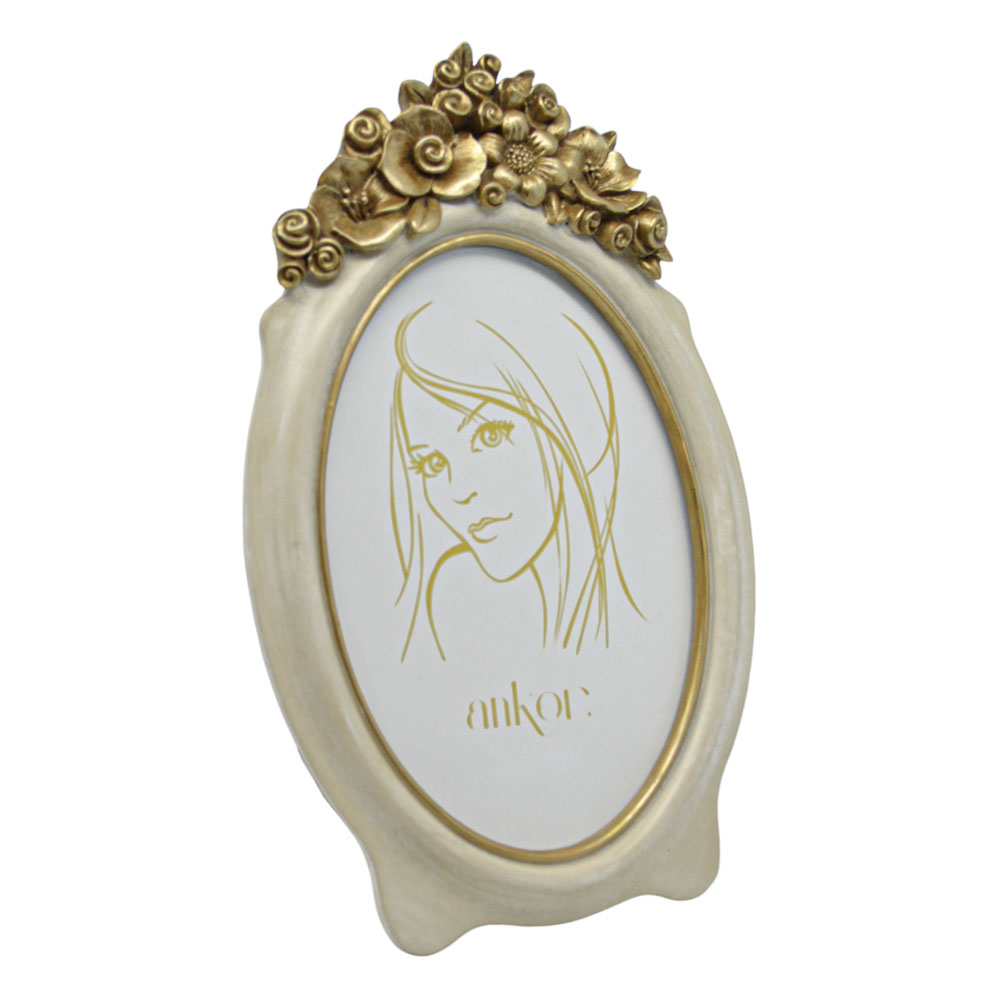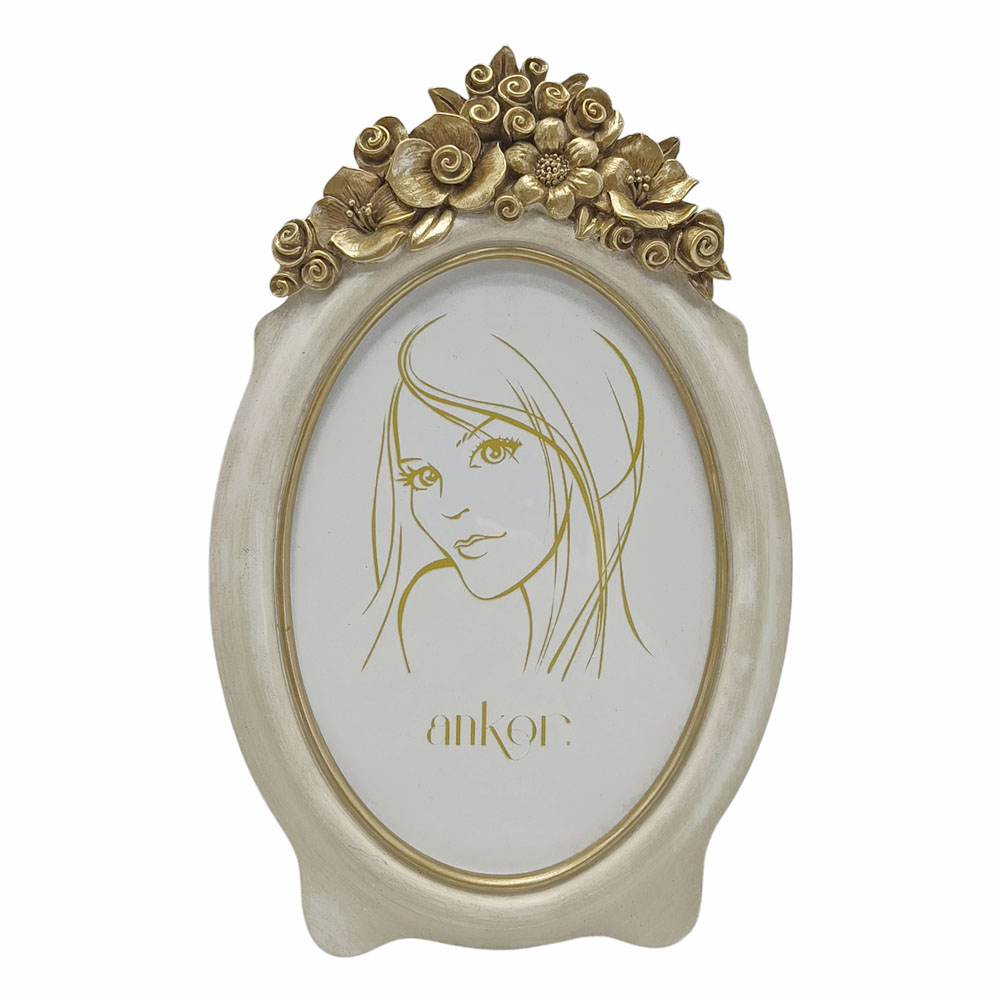 Οβάλ κορνίζα η οποία διαθέτει ένα εκλεπτυσμένο σχέδιο με χρυσές ανάγλυφες λεπτομέρειες λουλουδιών στην κορυφή, προσδίδοντας έναν ρομαντικό και κλασικό χαρακτήρα. Ιδανική για να πλαισιώσει τις αγαπημένες σας φωτογραφίες.