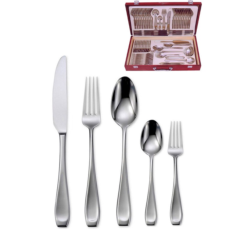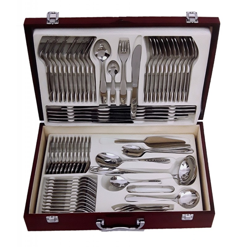 Μαχαιροπίρουνα από ανοξείδωτο ατσάλι 18/10 διατίθενται σε πολυτελή βαλίτσα των 72 τεμαχίων. Τα μαχαιροπίρουνα έχουν μεγάλη αντοχή, δεν φθείρονται εύκολα και είναι ανθεκτικά στο πλυντήριο πιάτων.    Το σετ αποτελείται:    12 μαχαίρια φαγητού     12 πιρούνια φαγητού    12 κουτάλια φαγητού    12 πιρουνάκια γλυκού     12 κουταλάκια γλυκού    1 κουτάλα σούπας    1 κουτάλι σάλτσας    1 ζεύγος σαλάτας    2 κουτάλια σερβιρίσματος    1 σπάτουλα  1 λαβίδα    2 πιρούνια σερβιρίσματος  1 κουτάλι μουστάρδας  1 κουτάλι κρέμας