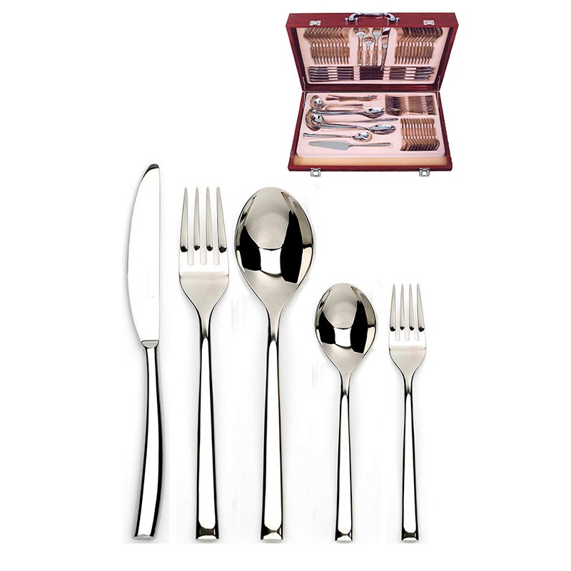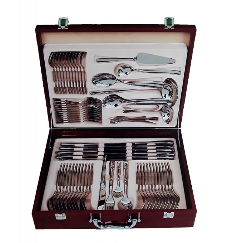 Μαχαιροπίρουνα από ανοξείδωτο ατσάλι 18/10 διατίθενται σε πολυτελή βαλίτσα των 72 τεμαχίων. Τα μαχαιροπίρουνα έχουν μεγάλη αντοχή, δεν φθείρονται εύκολα και είναι ανθεκτικά στο πλυντήριο πιάτων.Το σετ αποτελείται:12 μαχαίρια φαγητού12 πιρούνια φαγητού12 κουτάλια φαγητού12 πιρουνάκια γλυκού12 κουταλάκια γλυκού1 κουτάλα σούπας1 κουτάλι σάλτσας1 ζεύγος σαλάτας2 κουτάλια σερβιρίσματος1 σπάτουλα1 λαβίδα2 πιρούνια σερβιρίσματος1 κουτάλι μουστάρδας1 κουτάλι κρέμας