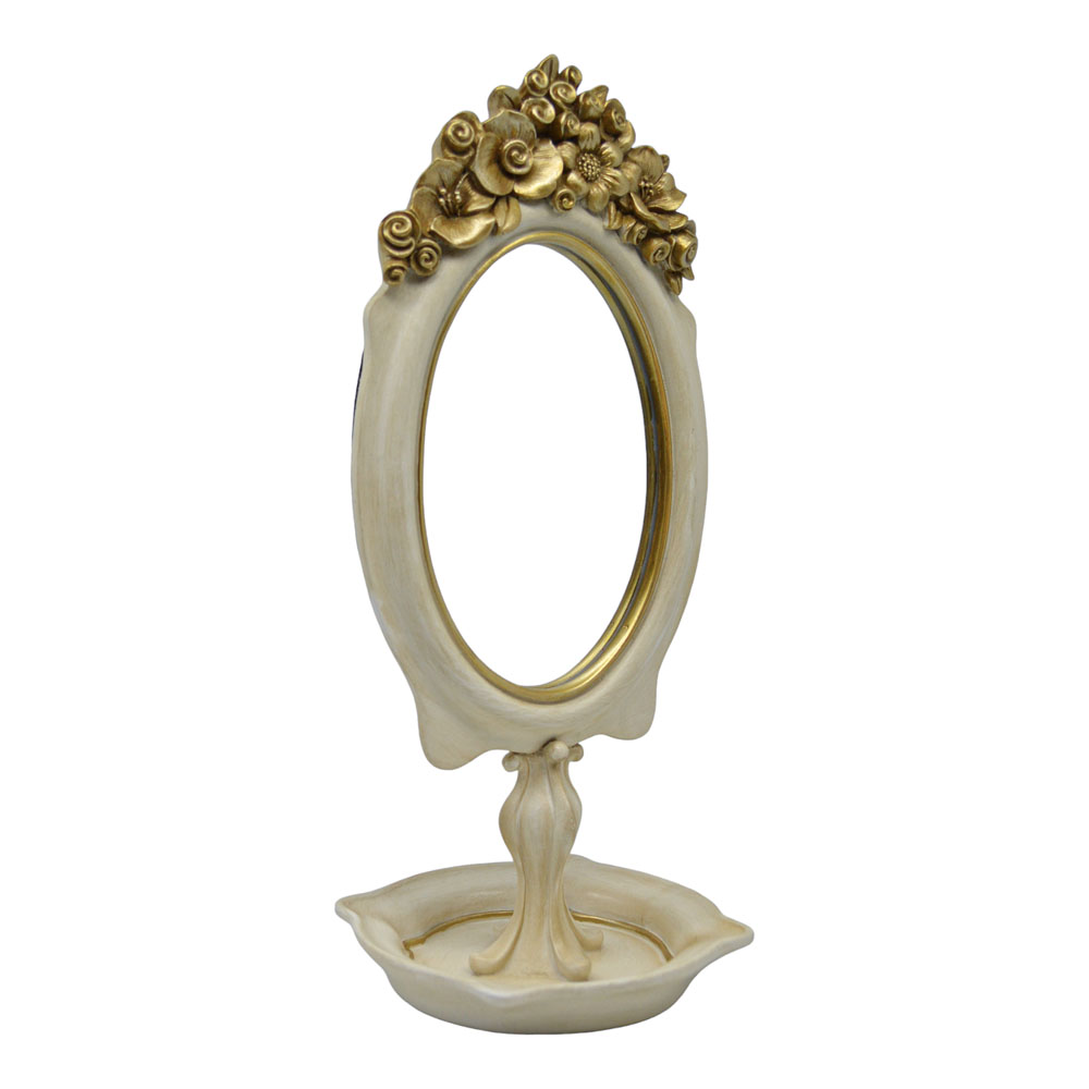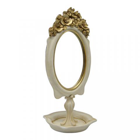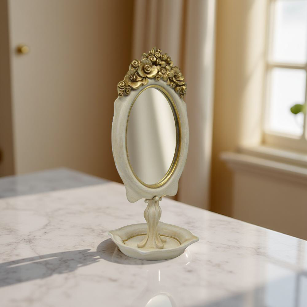 Καθρέφτης επιτραπέζιος πολυεστερικός με χρυσές ανάγλυφες λεπτομέρειες στο επάνω μέρος του πλαισίου. Με τη ρομαντική και vintage αισθητική του, είναι ιδανικός για να προσθέσει μια κλασική πινελιά σε οποιοδήποτε χώρο, όπως κρεβατοκάμαρες ή μπουντουάρ.