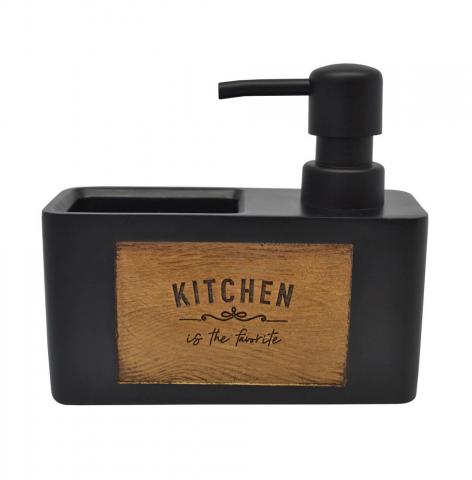Σαπουνοθήκη για υγρό σαπούνι πολυεστερική σε μαύρο χρώμα, διακόσμηση από ξύλο μπαμπού και επιγραφή Kitchen. Διαθέτει θήκη για σφουγγάρι. Στην συσκευασία συμπεριλαμβάνεται το συρμάτινο σφουγγάρι.