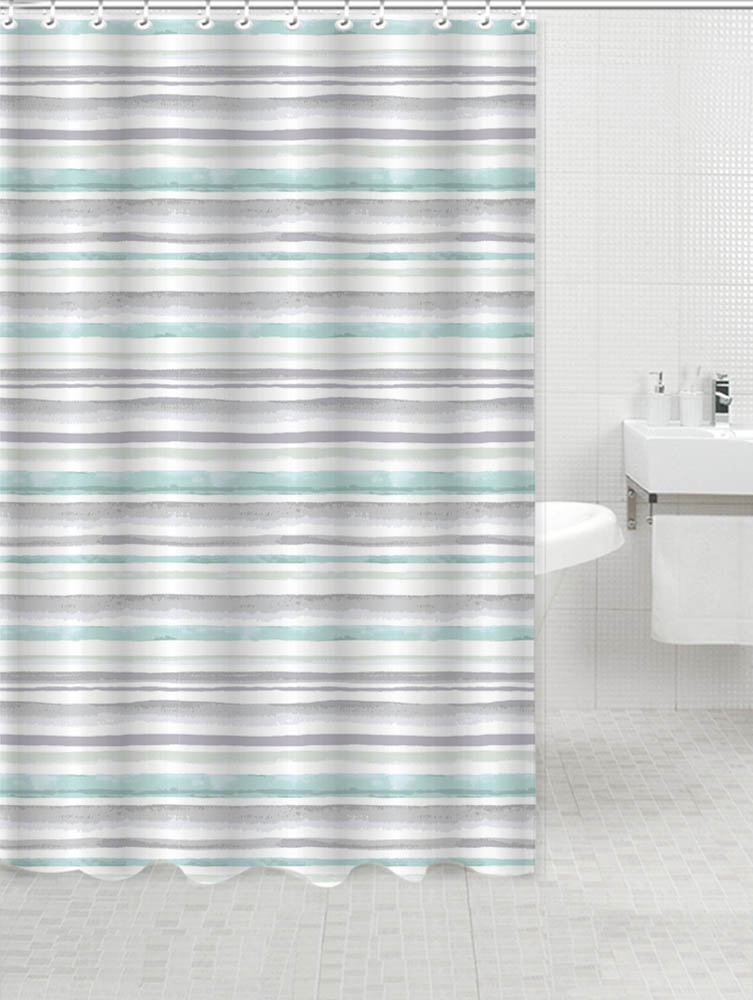Κουρτίνα πολυεστερική 90gsm, αδιάβροχη, σε άσπρο χρώμα και διακόσμηση γκρι και πετρολ οριζόντιες ρίγες . Στην συσκευασία συμπεριλαμβάνονται δώδεκα πλαστικοί κρίκοι. Είναι εύκολη στο καθάρισμα, μαλακή και ευχάριστη αν έρθει σε επαφή με το δέρμα
