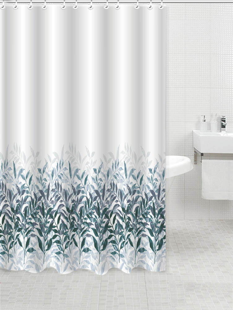 Κουρτίνα πολυεστερική 90gsm, αδιάβροχη, σε άσπρο χρώμα και διακόσμηση στο κάτω μέρος πετρόλ φύλλα . Στην συσκευασία συμπεριλαμβάνονται δώδεκα πλαστικοί κρίκοι. Είναι εύκολη στο καθάρισμα, μαλακή και ευχάριστη αν έρθει σε επαφή με το δέρμα.