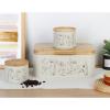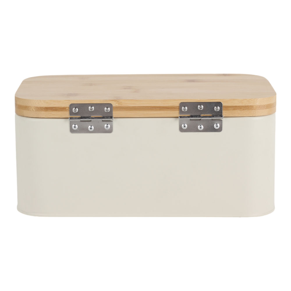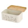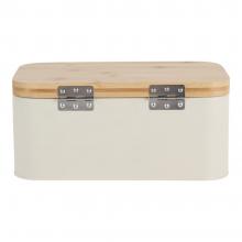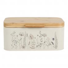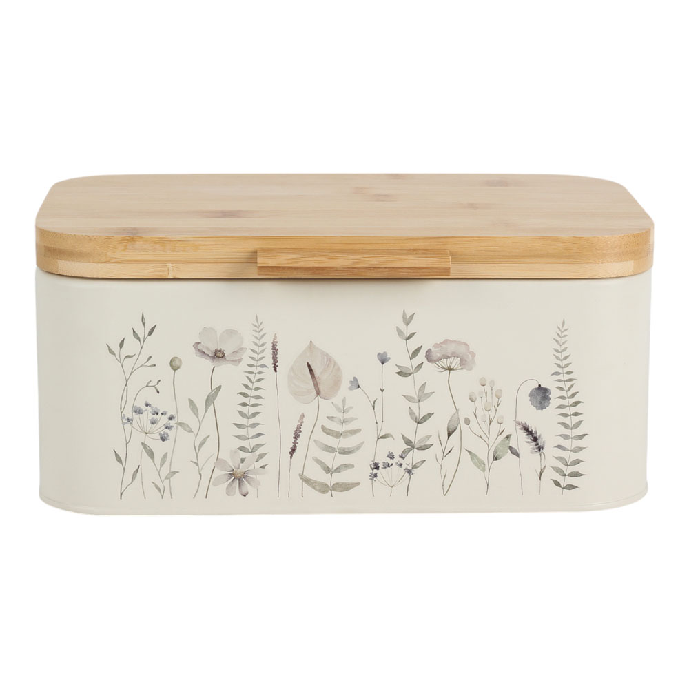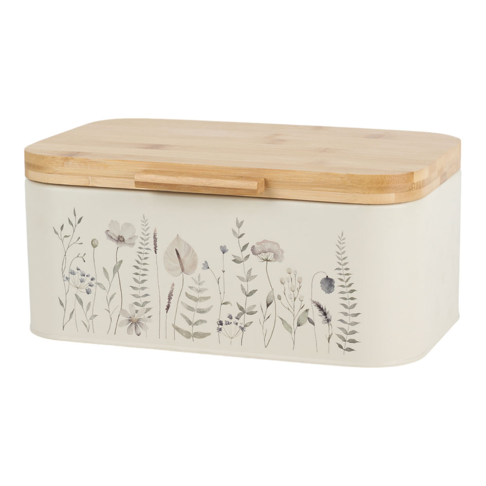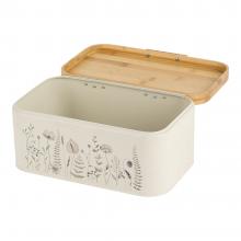 Μεταλλική ψωμιέρα σε μπεζ χρώμα, διακοσμημένη με κομψό σχέδιο βοτανικής έμπνευσης σε απαλούς τόνους και καπάκι από φυσικό bamboo. Ιδανική για την αποθήκευση ψωμιού και αρτοσκευασμάτων, προσθέτει μια φυσική πινελιά στον πάγκο της κουζίνας.
