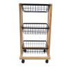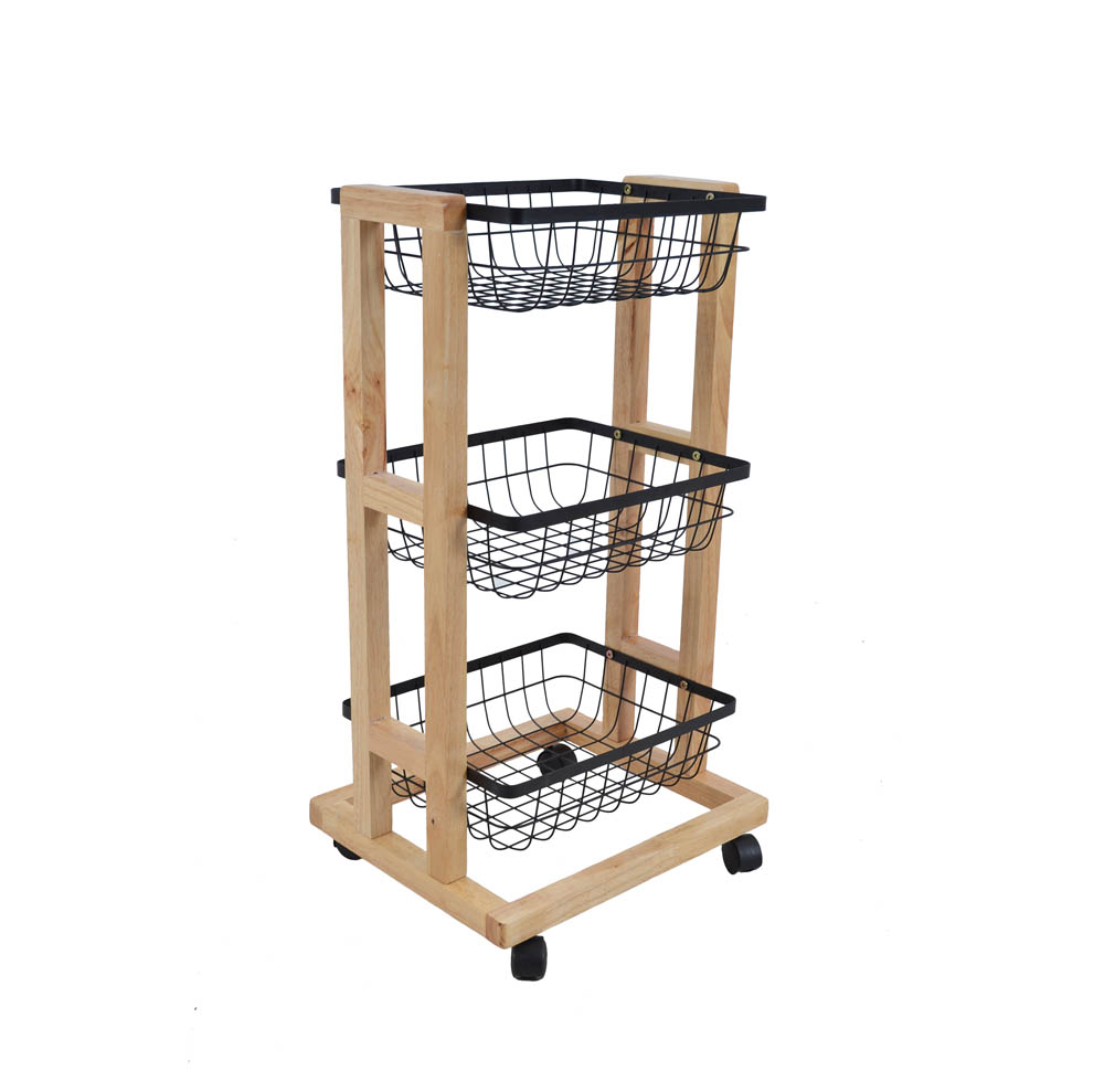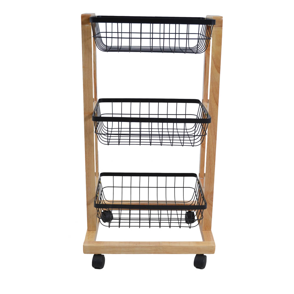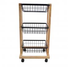 Τρόλεϊ κουζίνας με ξύλινο σκελετό σε φυσικό χρώμα και τρία μεταλλικά σταθερά καλάθια σε μαύρο ματ χρώμα. Ιδανικό για μεταφορά και αποθήκευση πραγμάτων.