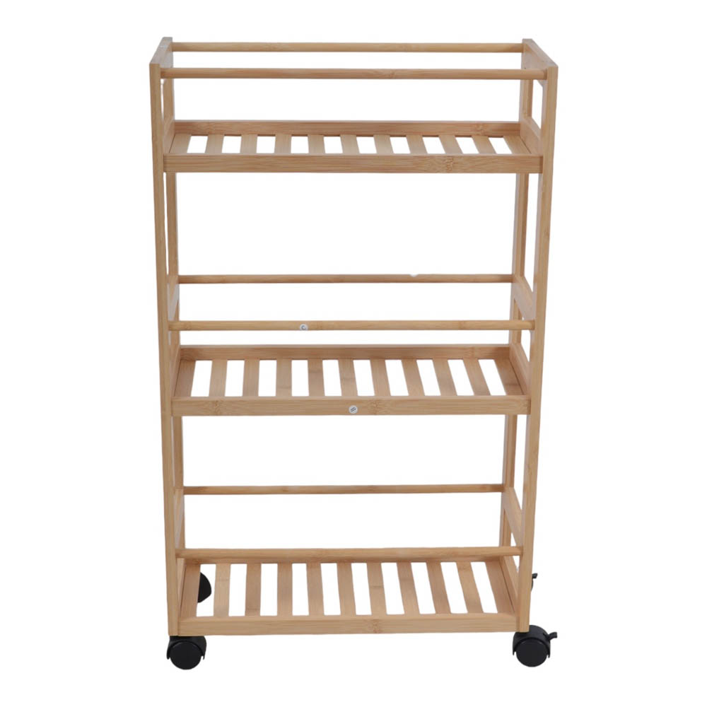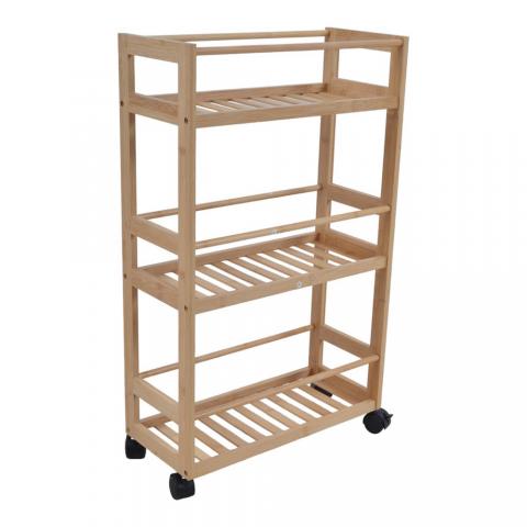 Ραφιέρα από ξύλο μπαμπού σε φυσικό χρώμα αποτελούμενη από 3 ράφια και τροχήλατη για εύκολη μεταφορά. Μπορεί να χρησιμοποιηθεί είτε στο μπάνιο ή και στη κουζίνα.