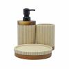 Σαπουνοθήκη για υγρό σαπούνι πολυεστερική, σε μπεζ χρώμα με διακόσμηση ανάγλυφες γραμμές, ξύλο ακακίας στο πάνω μέρος και αντλία σε μαύρο ματ χρώμα. Αξεσουάρ μπάνιου εξαιρετικής ποιότητας με μοντέρνο και κομψό σχεδιασμό.  Ύψος προϊόντος (cm): 17,5 Μήκος προϊόντος (cm): 7,9 Πλάτος προϊόντος (cm): 7.9 Βάρος Τεμαχίου (kg): 0,429