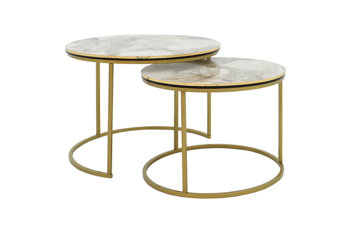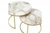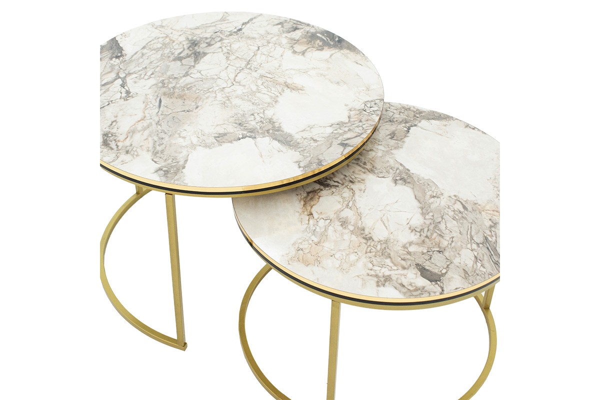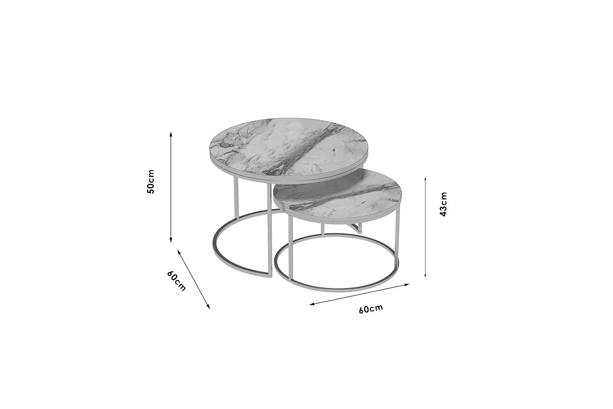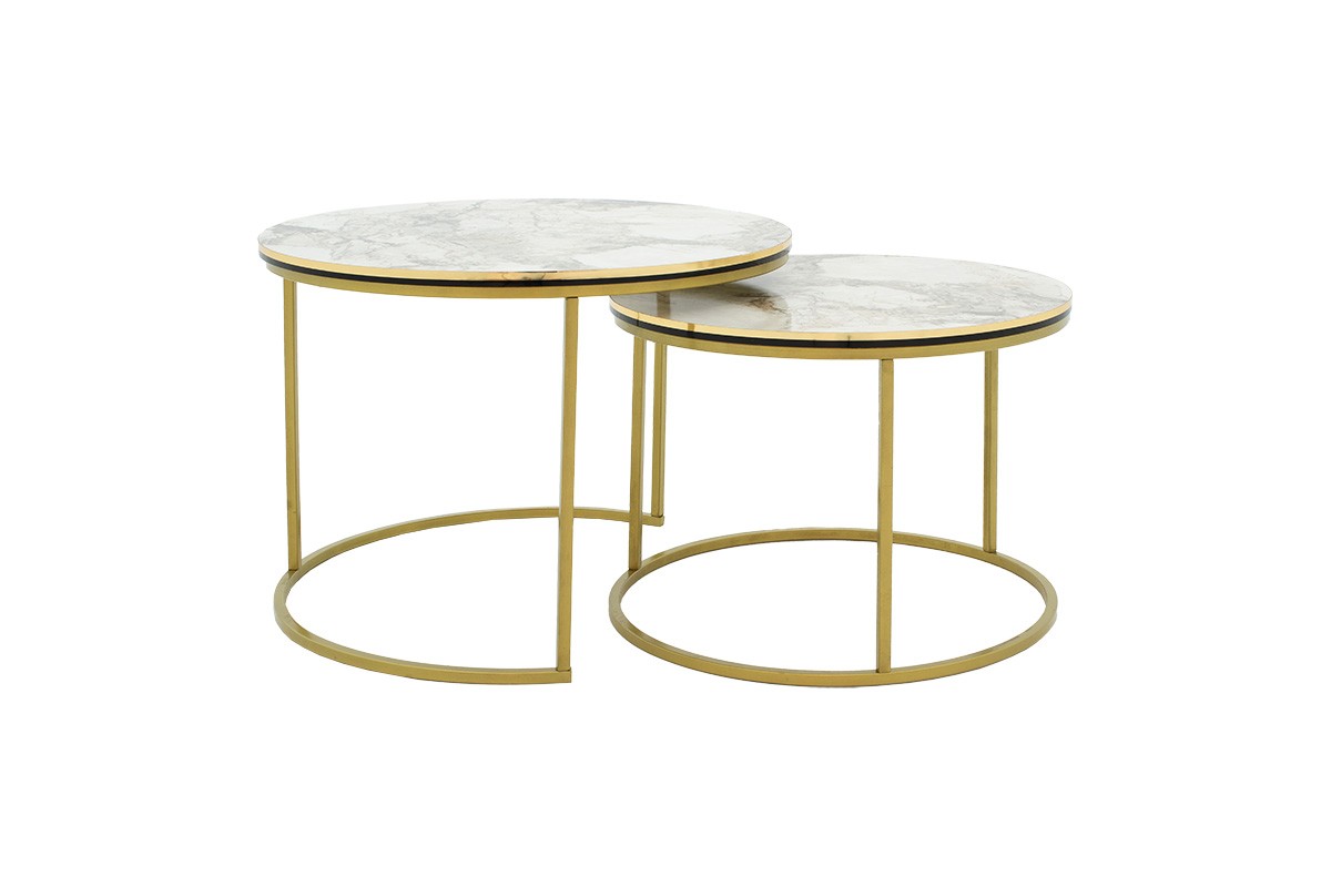 Τεχνικά χαρακτηριστικά:* Επιφάνεια κατασκευασμένη από μοριοσανίδας με επένδυση μελαμίνης σε χρώμα λευκό-μαύρο μαρμάρου υψηλής ποιότητας και μεγάλης αντοχής. Περιμετρικά φέρει ταινία PVC μαύρου και χρυσού χρώματος. * Στήριξη σε ενισχυμένο μεταλλικό σκελετό ηλεκτροστατικής βαφής χρυσού ματ χρώματος, μεγάλης αντοχής σε χτυπήματα. Καταλήγει σε μεταλλικά πόδια εξαιρετικής σταθερότητας.* Τα τελειώματα των ποδιών έχουν πλαστικά πέλματα για την προστασία του πατώματος από ανεπιθύμητες φθορέςΔιάσταση μεγάλου τραπεζιού: Μήκος: 70  εκ.Πλάτος: 70  εκ.Ύψος: 50  εκ.Διάσταση μικρού τραπεζιού: Μήκος: 60  εκ.Πλάτος: 60  εκ.Ύψος: 43  εκ.