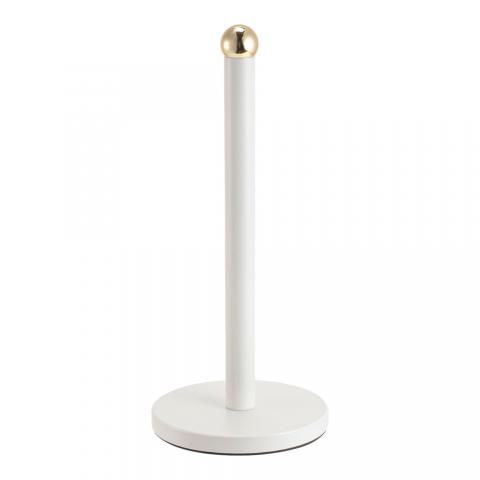 Μεταλλική βάση για χαρτί κουζίνας με σταθερή στρογγυλή βάση και λιτό, μοντέρνο σχεδιασμό, σε λευκό ματ χρώμα με διακριτική χρυσή λεπτομέρεια στο επάνω μέρος. Ιδανική για εύκολη χρήση και τακτοποιημένο πάγκο κουζίνας.