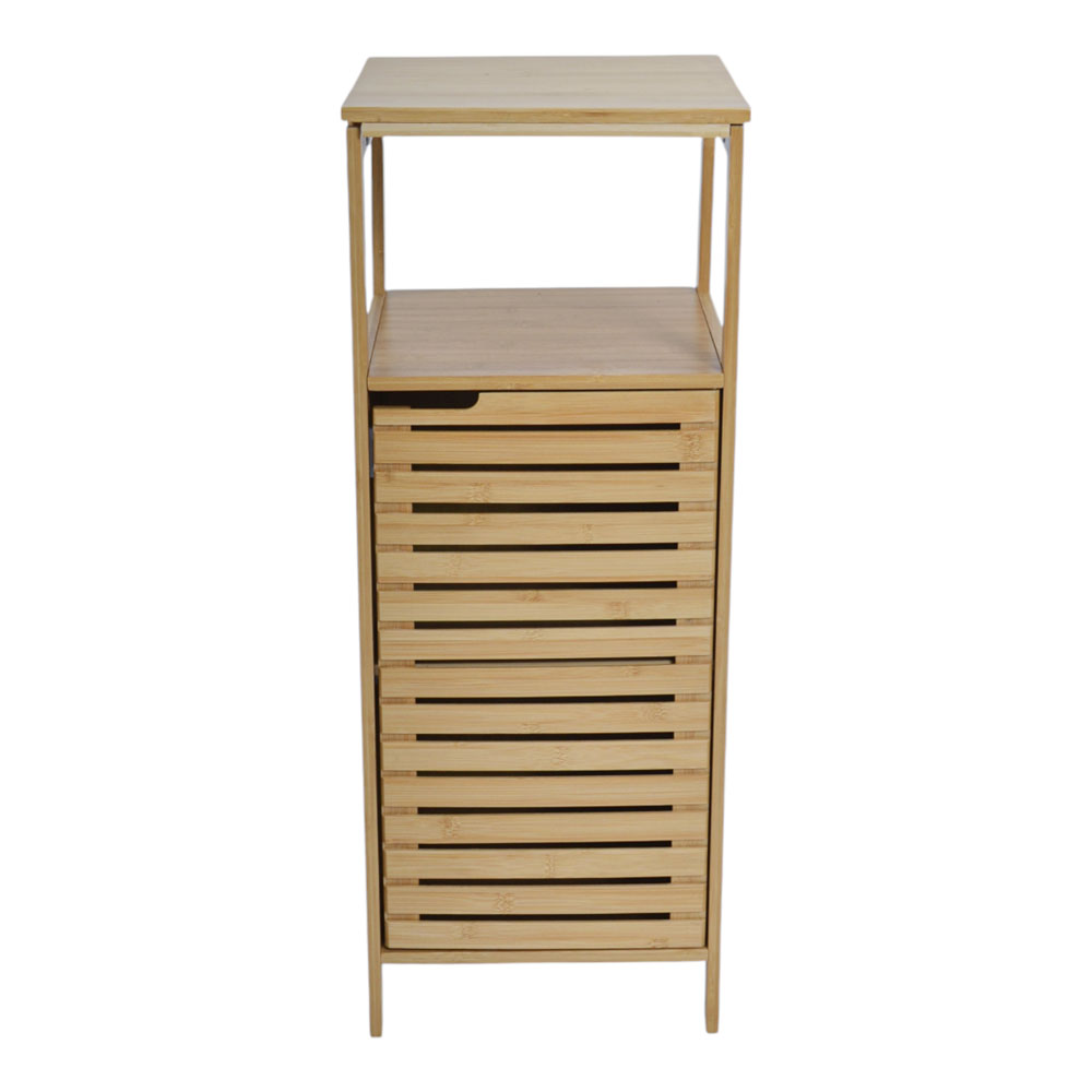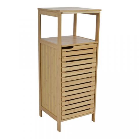 Κομψό ντουλάπι από φυσικό μπαμπού με δύο εσωτερικά ράφια και πόρτα με περσίδες. Στο πάνω μέρος διαθέτει ανοιχτό ράφι για εύκολη πρόσβαση ή διακόσμηση. Ιδανικό για χρήση σε μπάνιο, κουζίνα ή υπνοδωμάτιο.